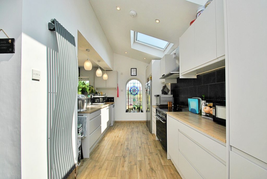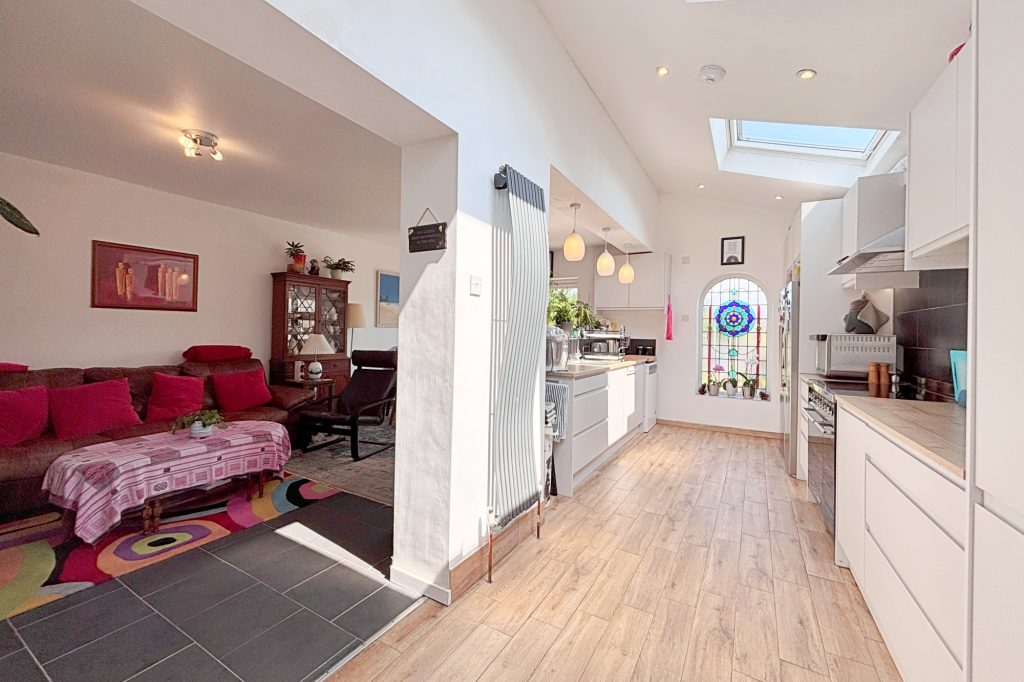 The accommodation briefly comprises; an entrance hall with a fitted cupboard housing the gas fired boiler. The impressive open plan kitchen/dining/living space also incorporating a study area has double doors leading out to the garden a feature stained glass window and further skylight windows. The kitchen area comprises a good range of base and eye level units, the range cooker and dishwasher or available subject to negotiation and there is space for a fridge freezer.