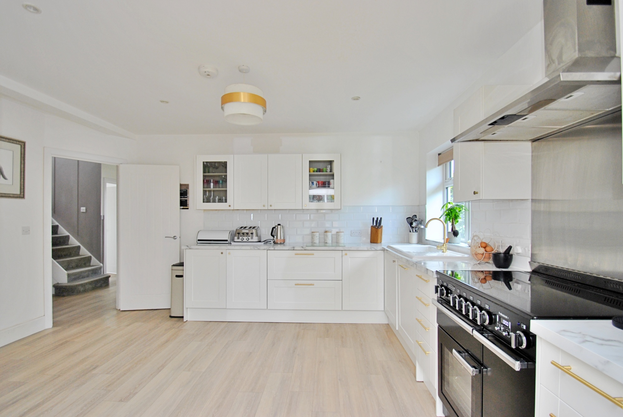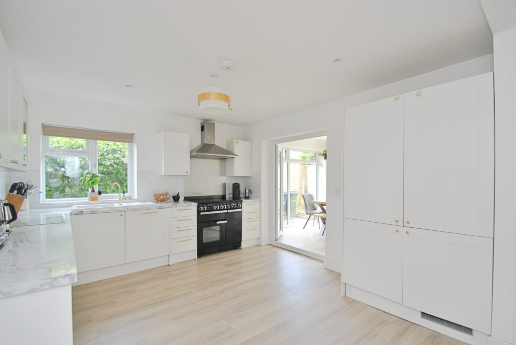 The modern kitchen offers a good range of base and eye level units with marble effect worktops, a ceramic sink, plus a fitted dishwasher and a range cooker with canopy over. The separate utility room provides further storage and space and plumbing for a washing machine and tumble dryer. Along the rear of the property is a garden/dining room with floor to ceiling windows and a sliding patio door gives access to the outdoor living space.