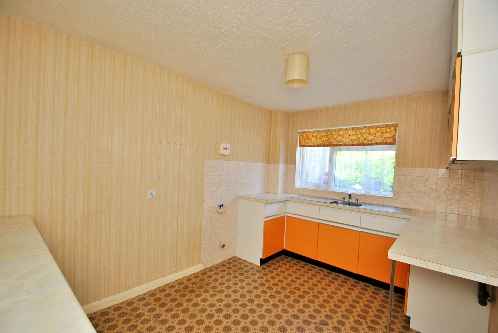 The kitchen offers a basic range of base and eye level units with space for various appliances.
