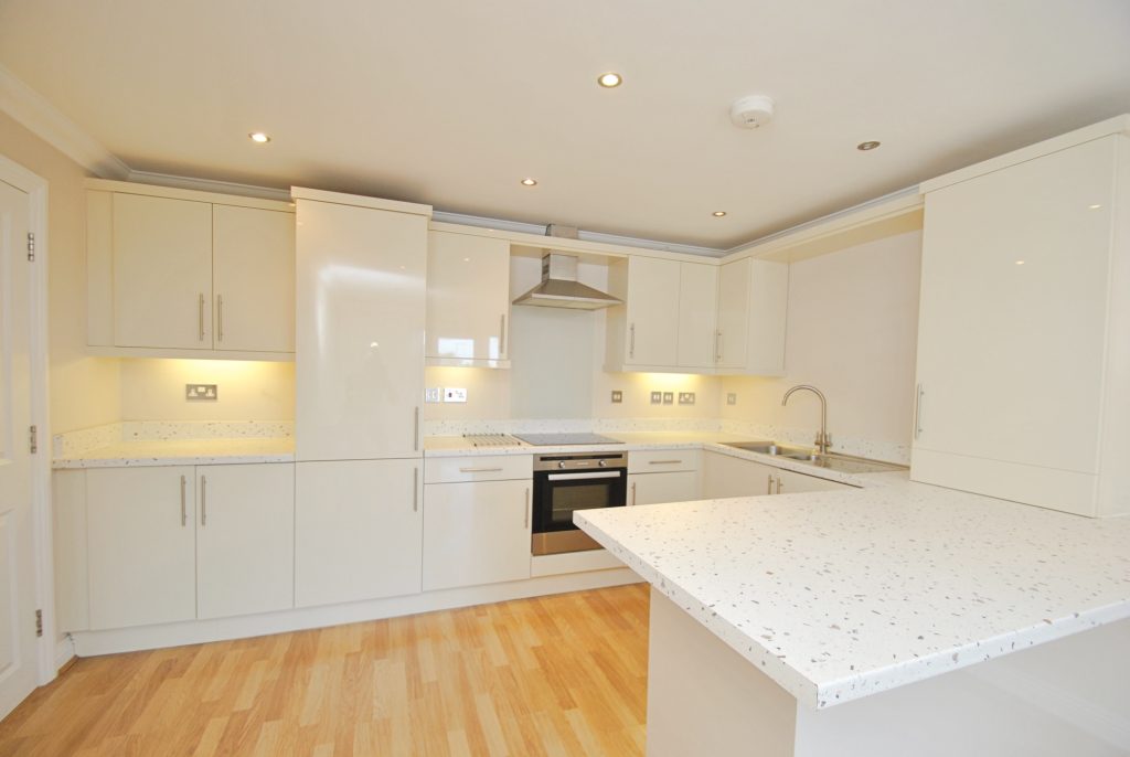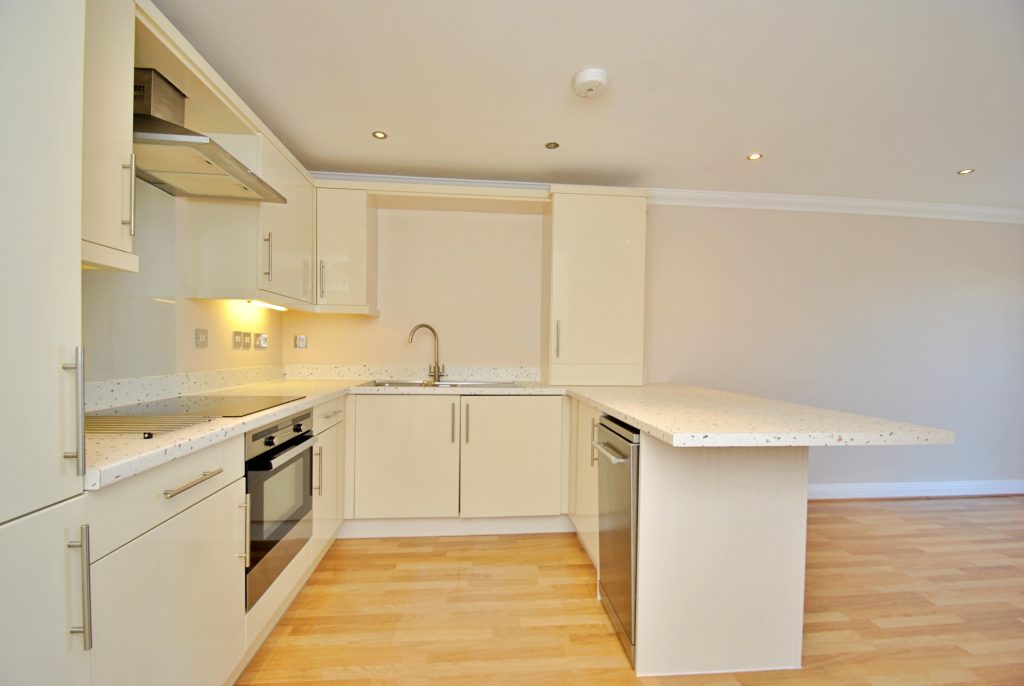 The open plan kitchen/living room has a sunny south westerly facing Juliet balcony with glimpses of the Purbeck Hills. The kitchen area offers a generous range of base and eye level units with a large peninsula breakfast bar. Fitted appliances include an oven and hob plus fridge freezer and washing machine with matching fascia units and a dishwasher.