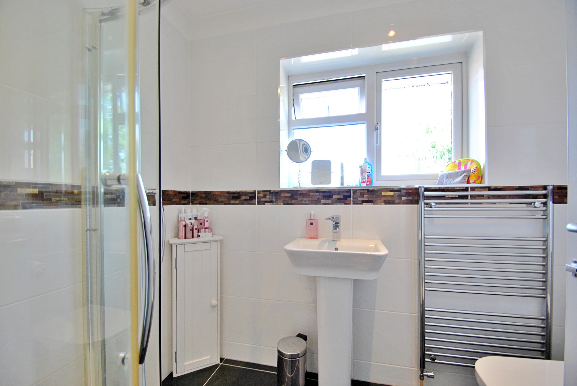 The shower room has been updated with a modern white three piece suite including a corner shower WC and wash basin.