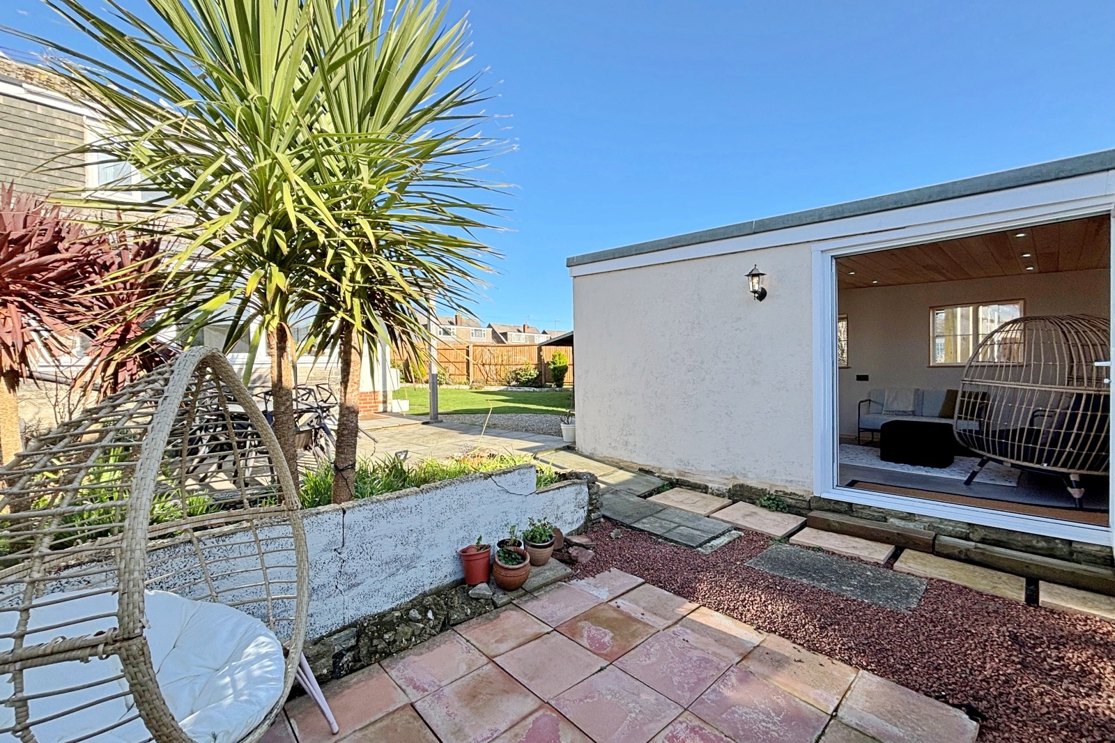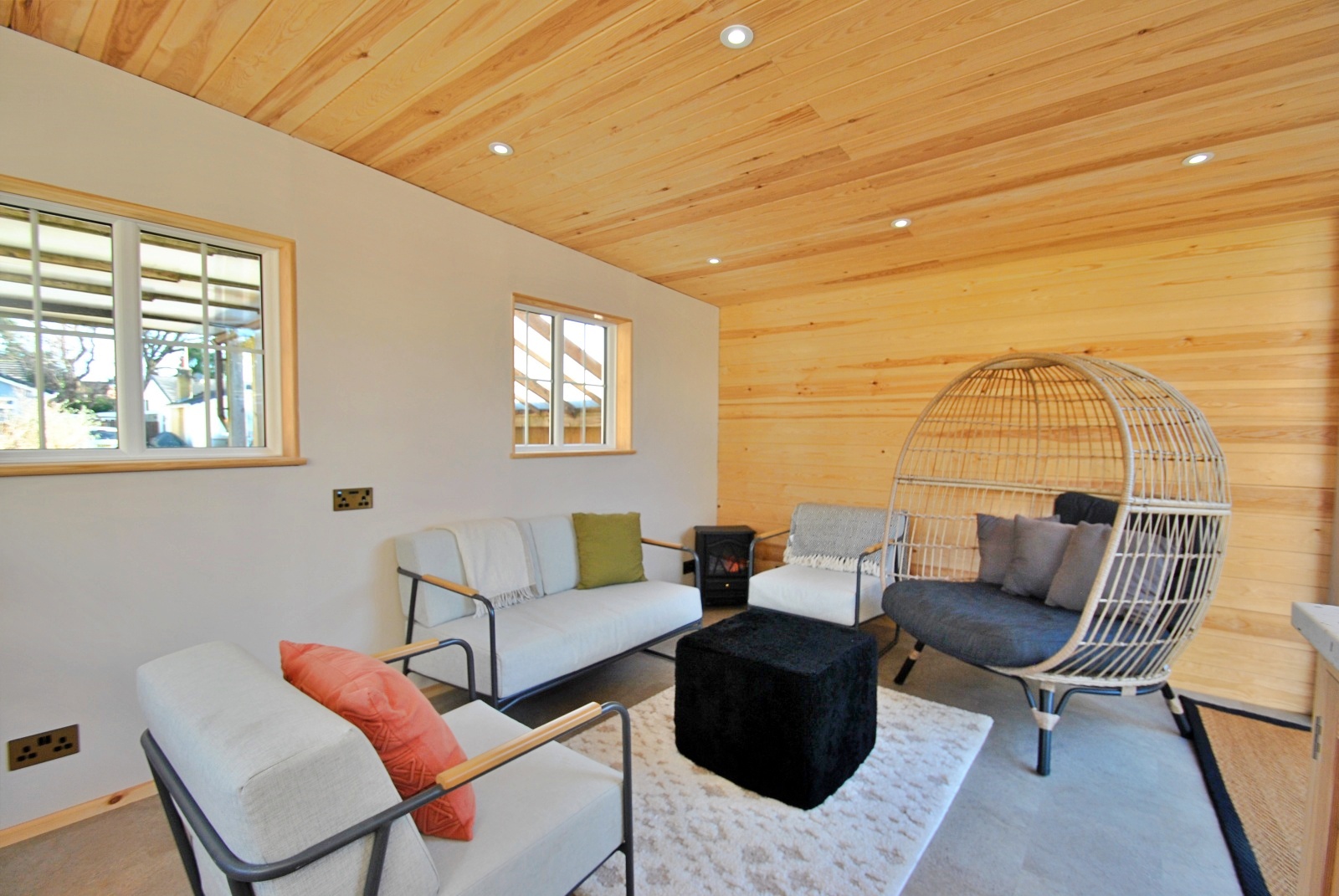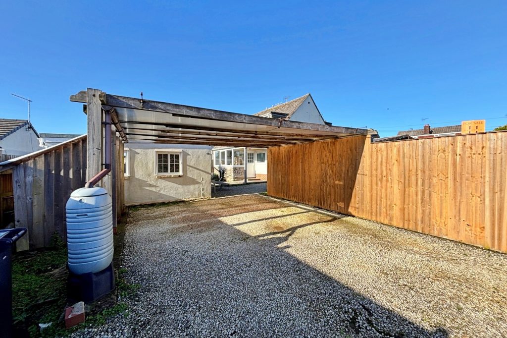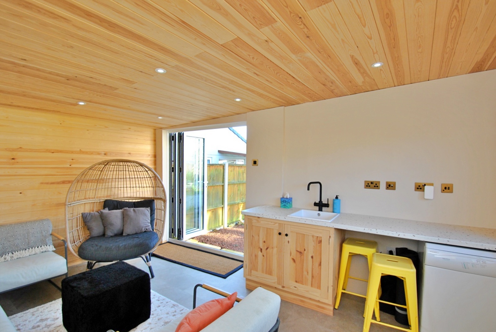 Outside there is driveway parking with a large covered carport. The enclosed rear and side garden is laid mainly to lawn with planted borders. There is a patio seating area and the detached garage has been converted to a home office/garden room with bifold doors providing access. It has power and light, a range of base level units with a sink (with hot water supply) and space for additional appliances for use as a utility area.