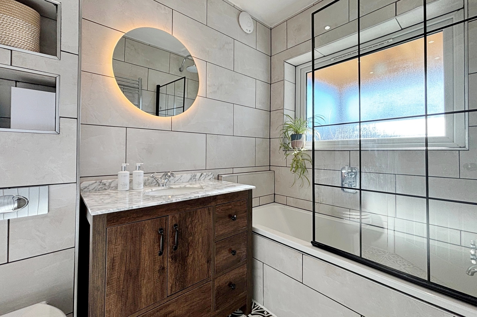 The family bathroom has been recently updated, the suite includes a vanity unit with marble top and an inset sink, WC, and a bath with shower over. Finished with fully tiled walls.