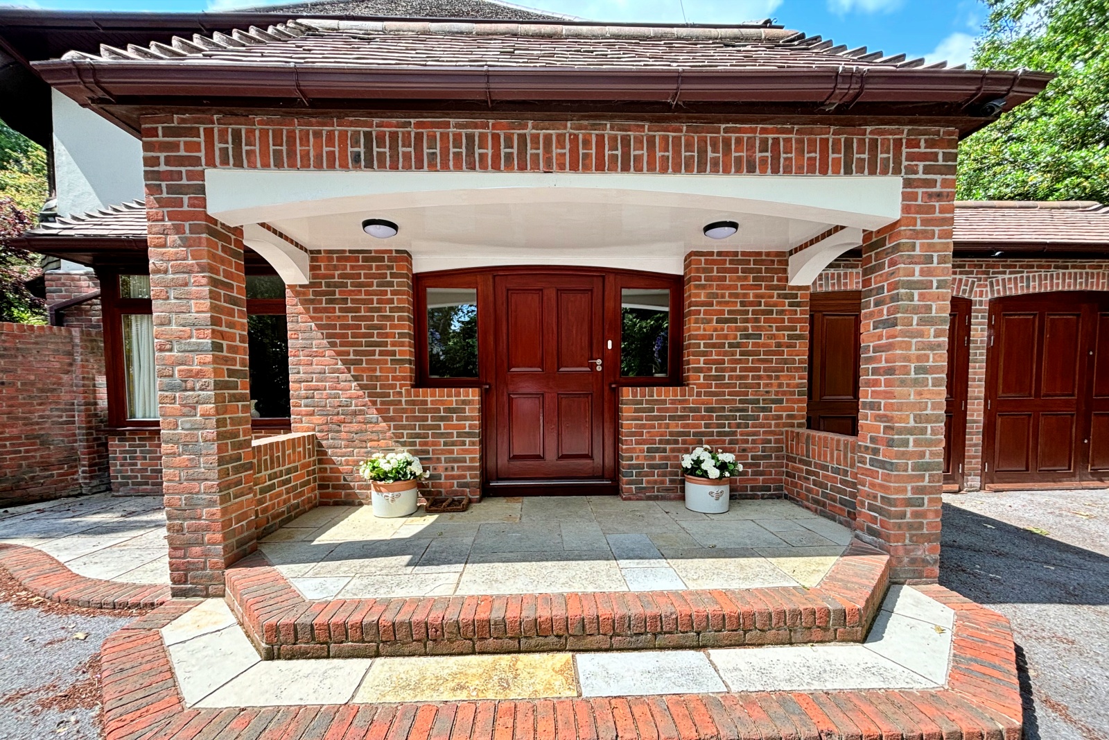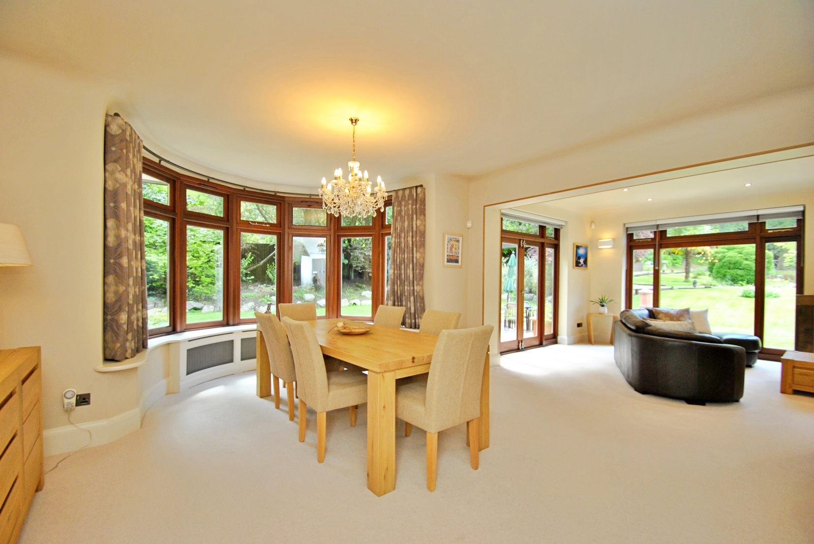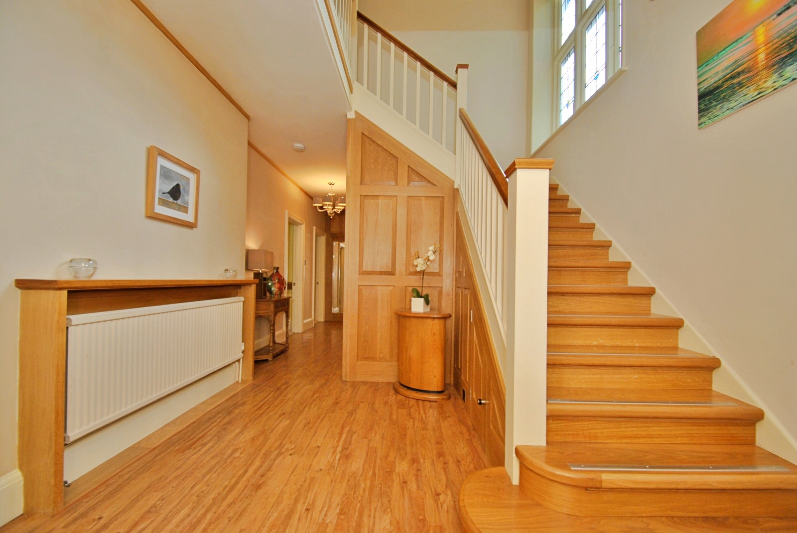 A covered entrance canopy and porch lead to the part wood panelled reception hall where stairs rise to the first floor. There are four main reception rooms including a family room and study, the dining room and sitting room are connected creating an open plan feel, all enjoying views across the gardens.