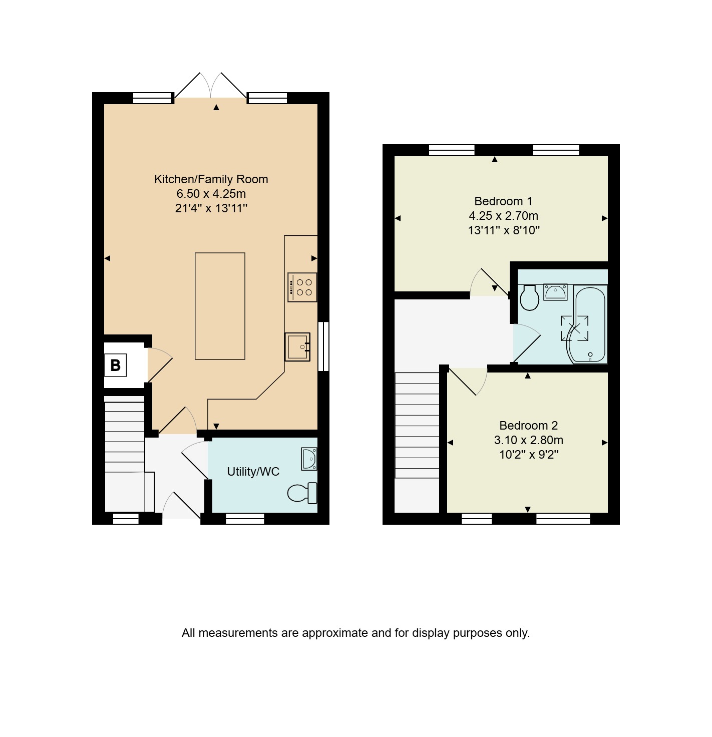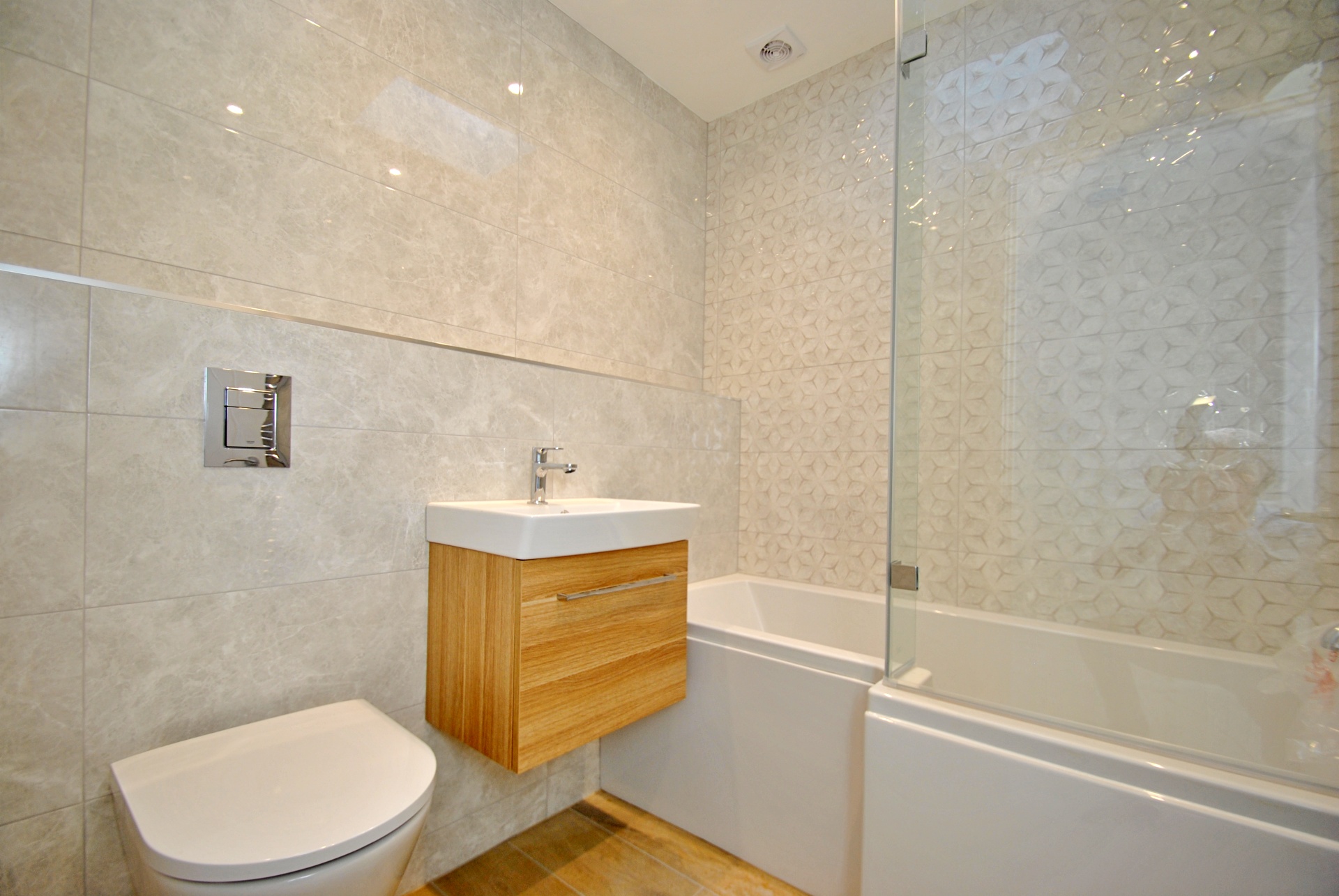 Upstairs you will find 2 well proportioned bedrooms and a contemporary bathroom with fully tiled walls, WC with concealed cistern, wash basin with built in vanity unit and a bath with shower and glazed shower screen over.