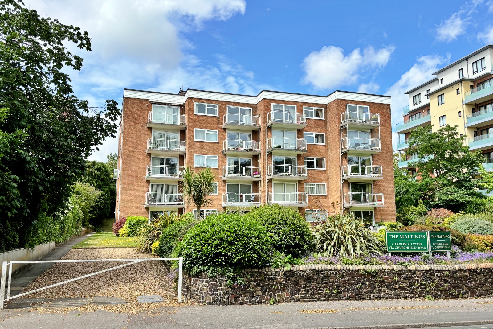 The Maltings is set in well-tended communal gardens. Vehicle access is from Churchfield Road behind, there is a single garage in the block together with visitors parking.