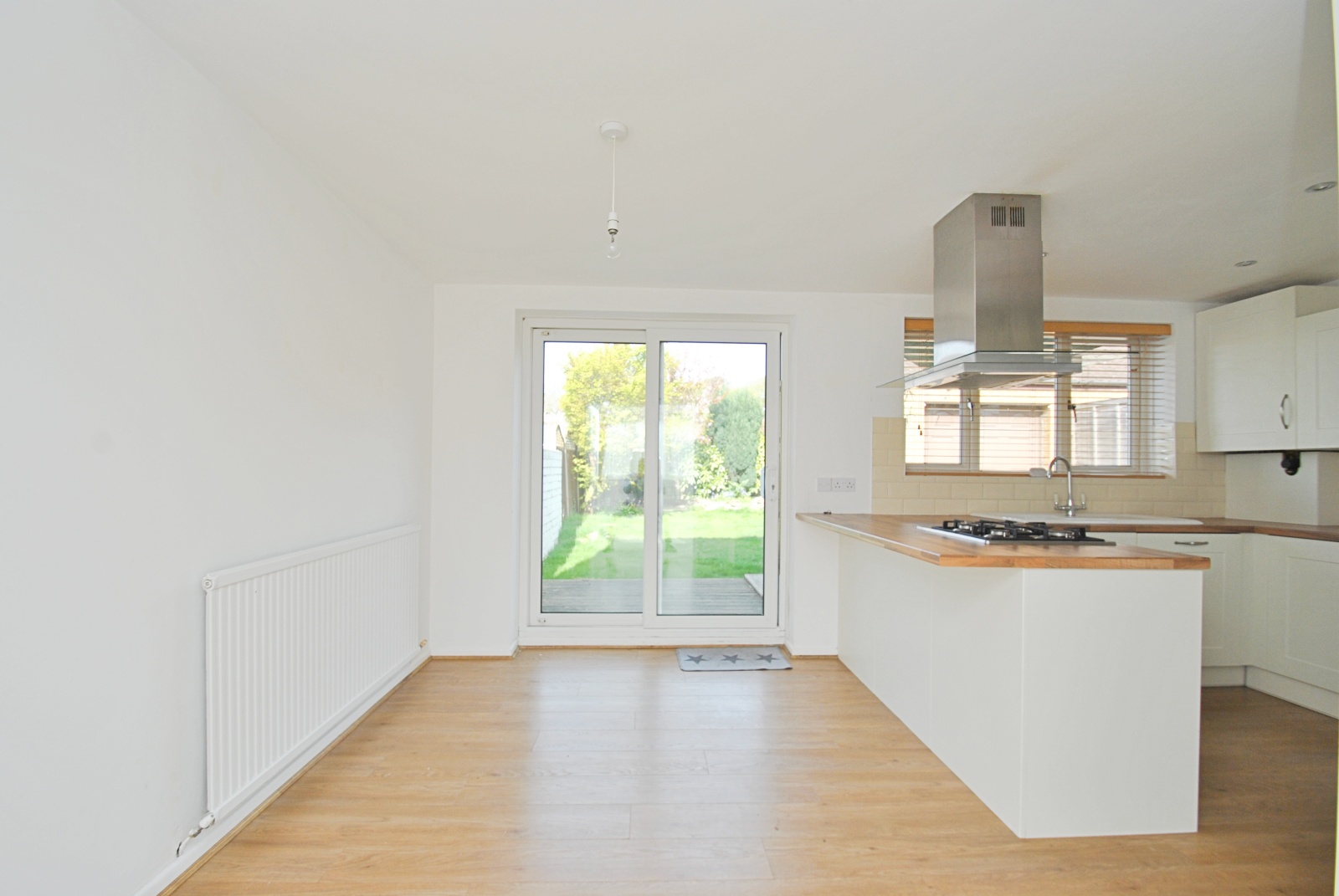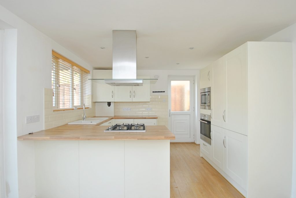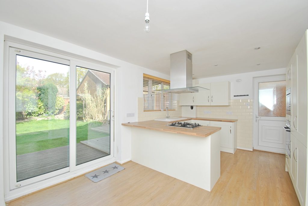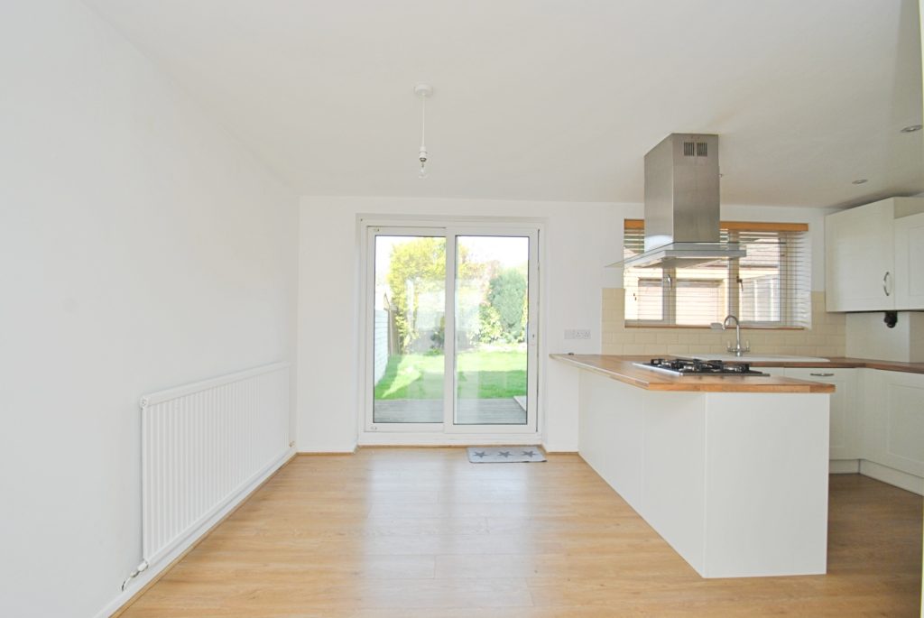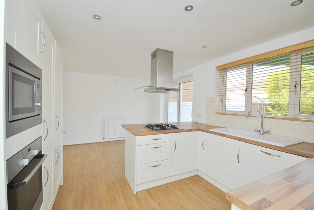 From the kitchen sliding patio doors give access to the rear garden and there is a further side door. The modern kitchen offers a range of base and eye level units and a breakfast bar. Fitted appliances include a gas hob, oven and microwave plus a washing machine fridge freezer and dishwasher all with matching fascia units.