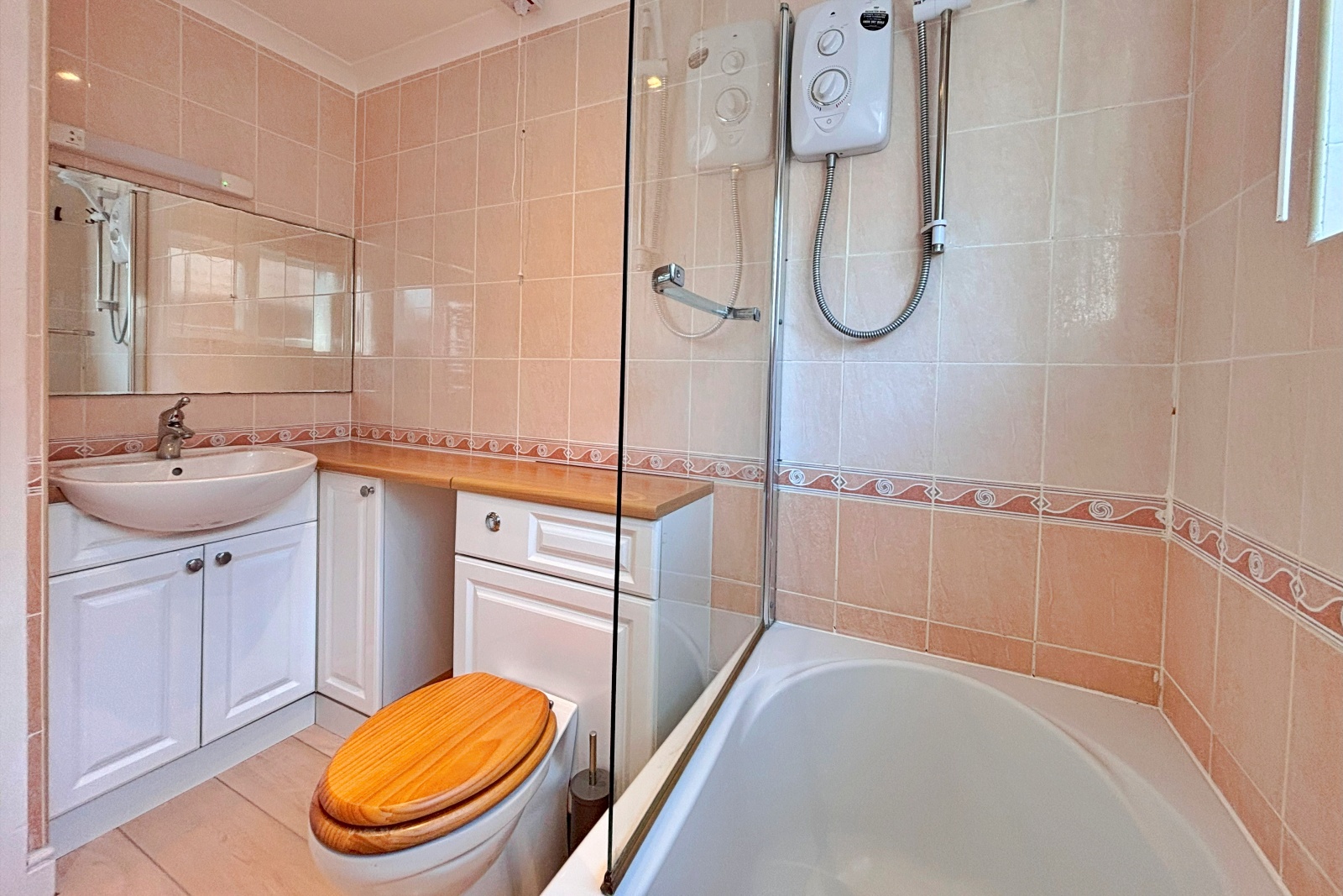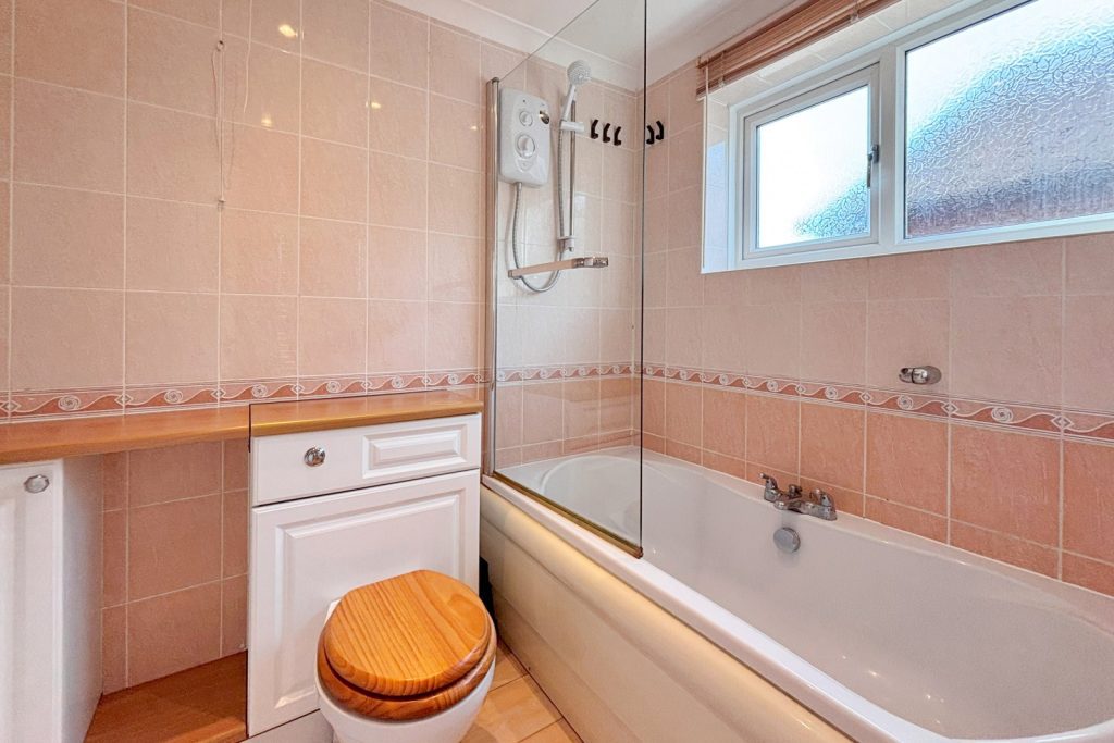 The bathroom has fully tiled walls and comprises a three piece suite including bath with shower over WC and wash basin.