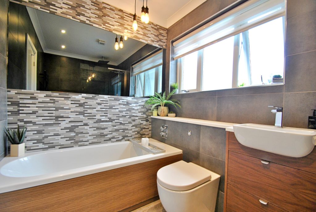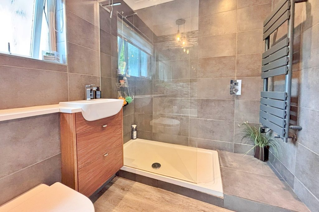 The modern bathroom has been updated in recent years with fully tiled walls and a contemporary 4 piece suite including a bath, WC, wash basin and separate shower.