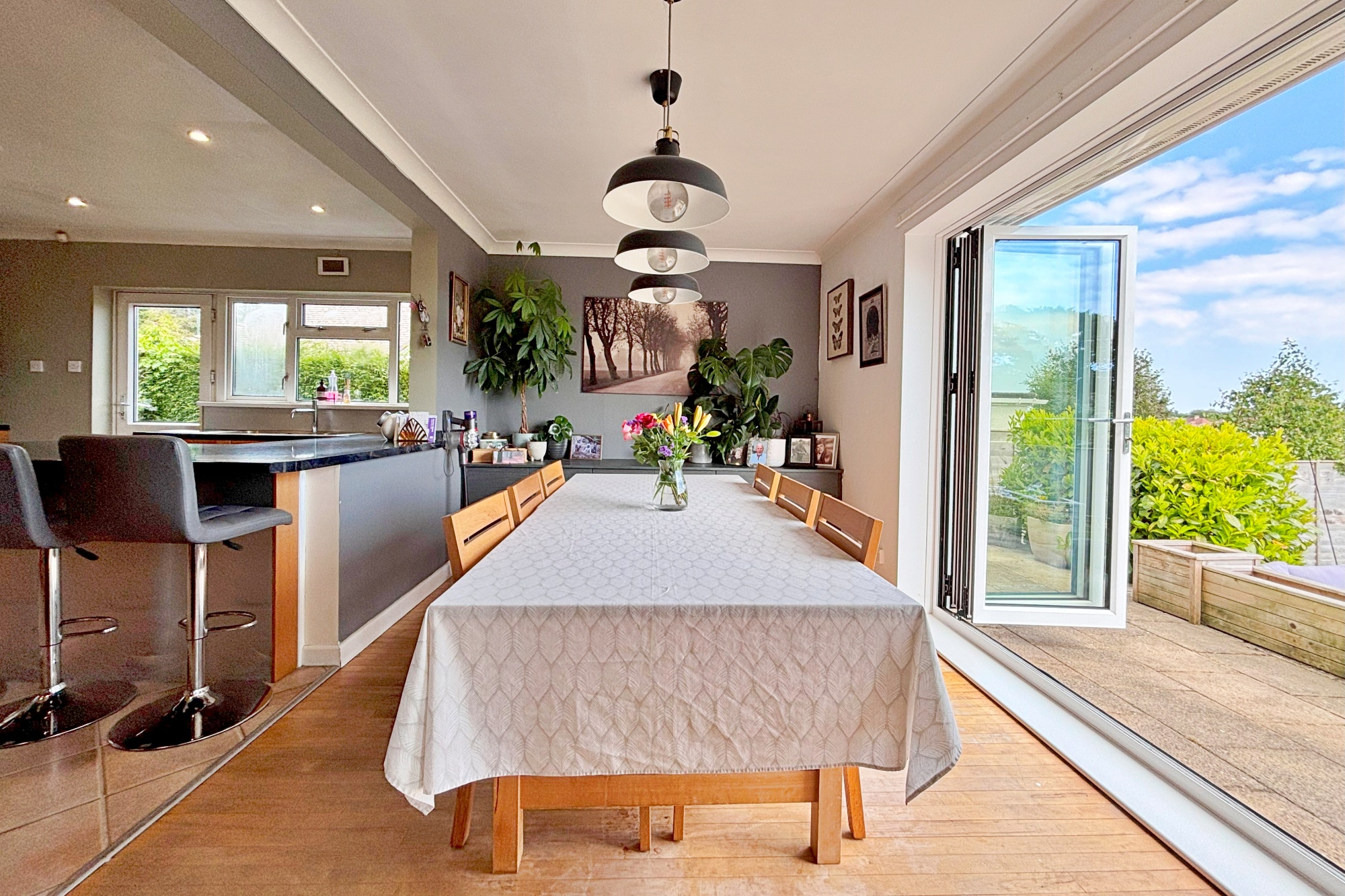 The sitting room overlooks the rear garden and double doors lead to the adjacent dining room. The dining room has an open plan arrangement with the kitchen, with bi folding doors giving access to the garden. The kitchen area offers a range of base and eye level units with fitted appliances including twin electric ovens with a gas hob over and a dishwasher. There is space for a fridge freezer and washing machine.