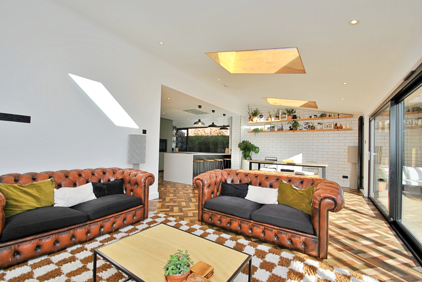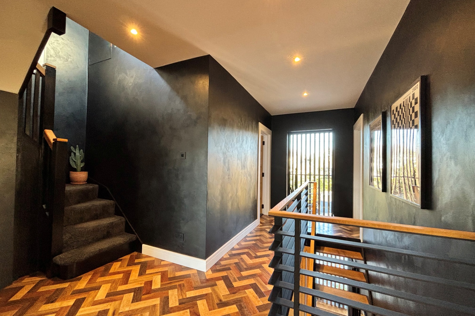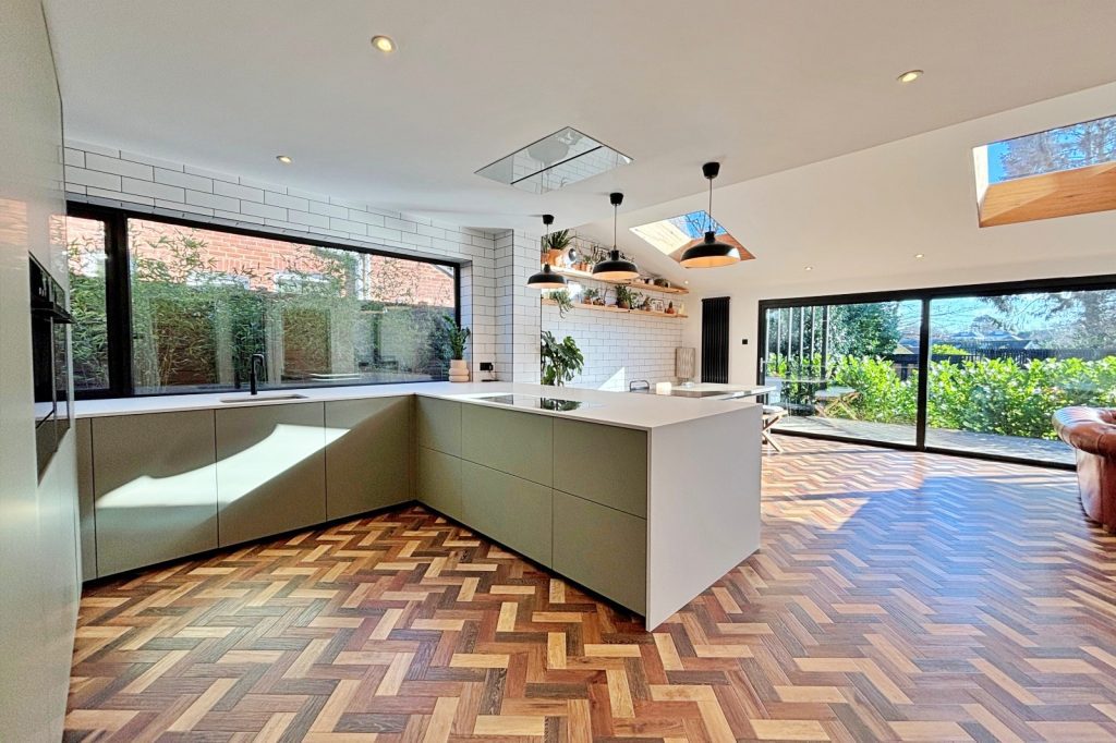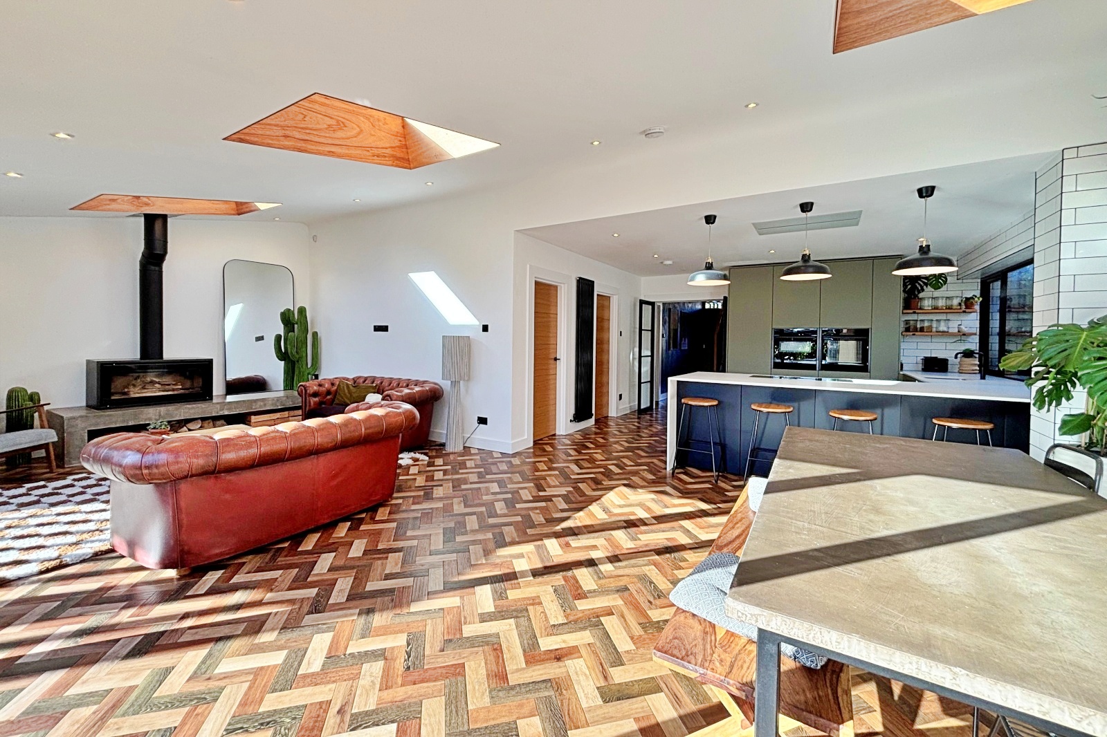 A reception hall with stairs rising to the first floor and striking herringbone LVT flooring. Double doors lead to the open plan living area and kitchen which runs along the rear of the house. sky light windows and floor to ceiling sliding doors allow in lots of light from the southerly facing aspect. The herringbone flooring continues throughout. There is a feature wood burner set on raised concrete plinth.