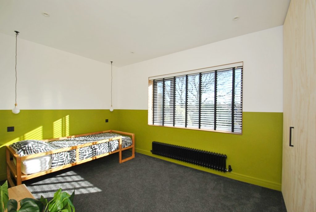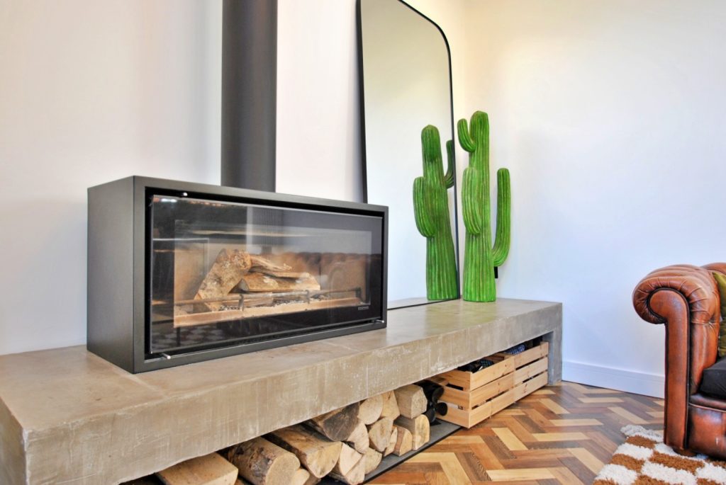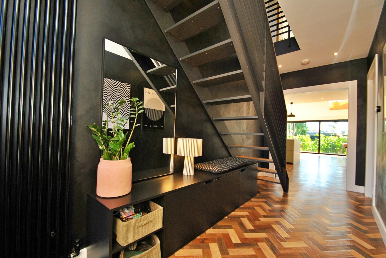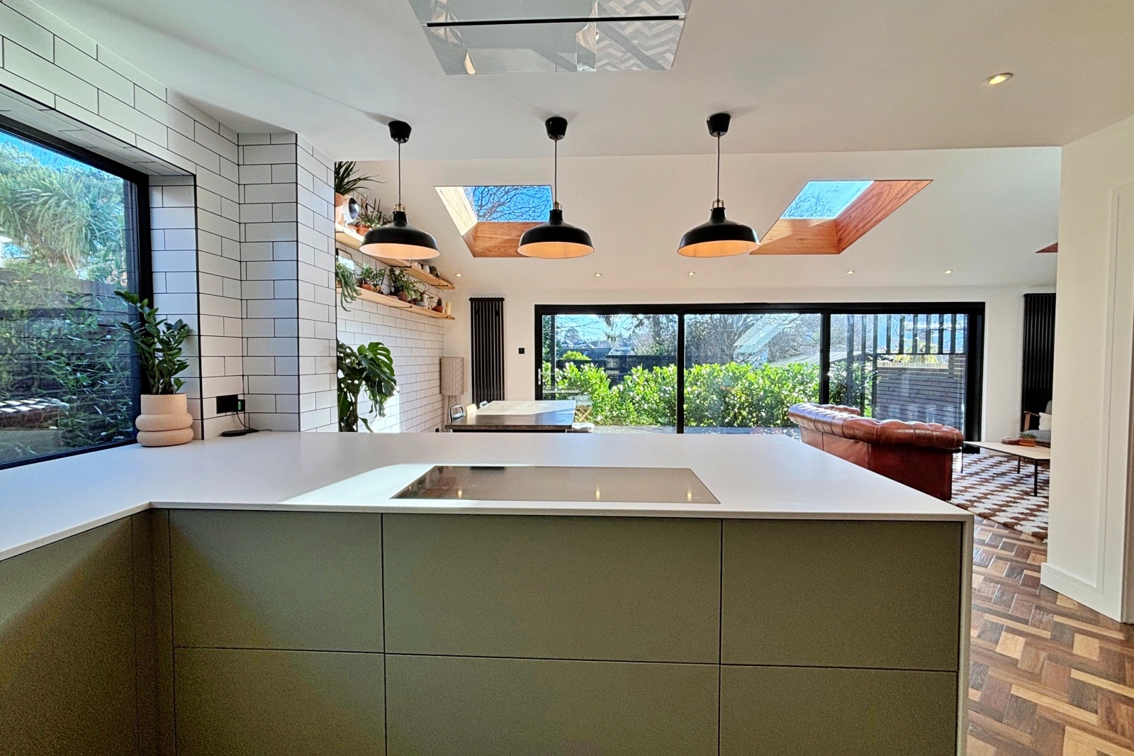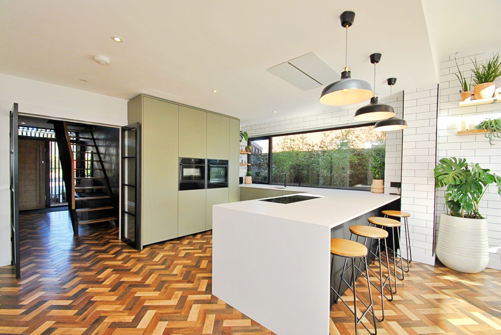 A reception hall with stairs rising to the first floor and striking herringbone LVT flooring. Double doors lead to the open plan living area and kitchen which runs along the rear of the house. sky light windows and floor to ceiling sliding doors allow in lots of light from the southerly facing aspect. The herringbone flooring continues throughout. There is a feature wood burner set on raised concrete plinth.