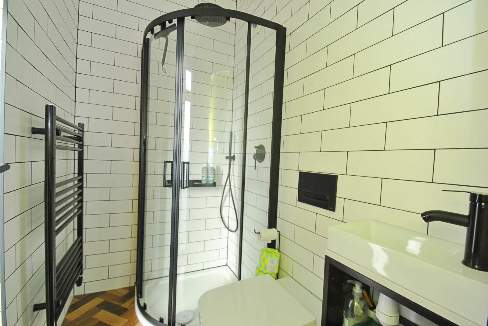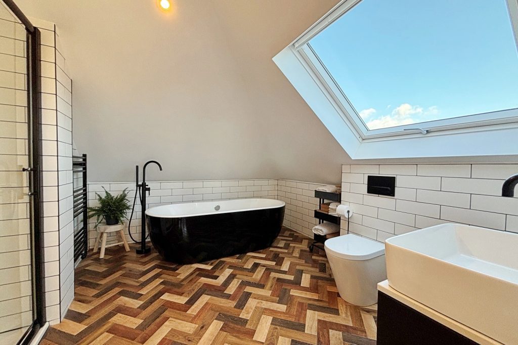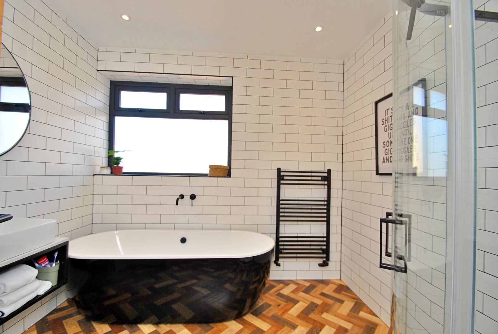The family bathroom has a four piece suite with a feature freestanding bath, separate corner shower, WC and wash basin, finished with fully tiled walls.