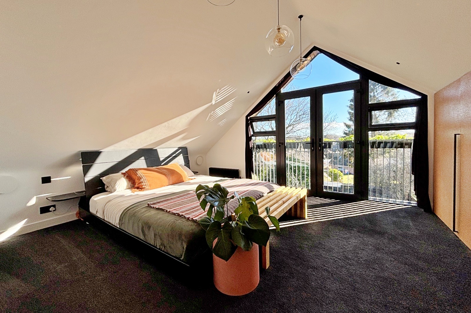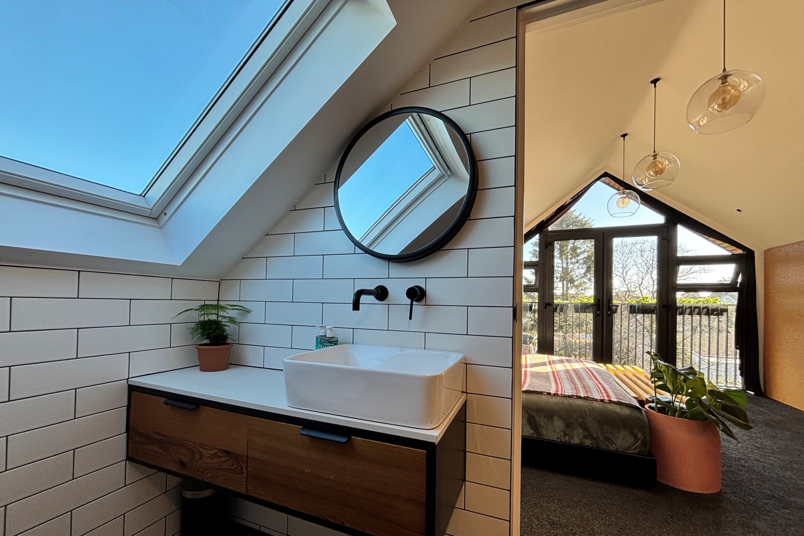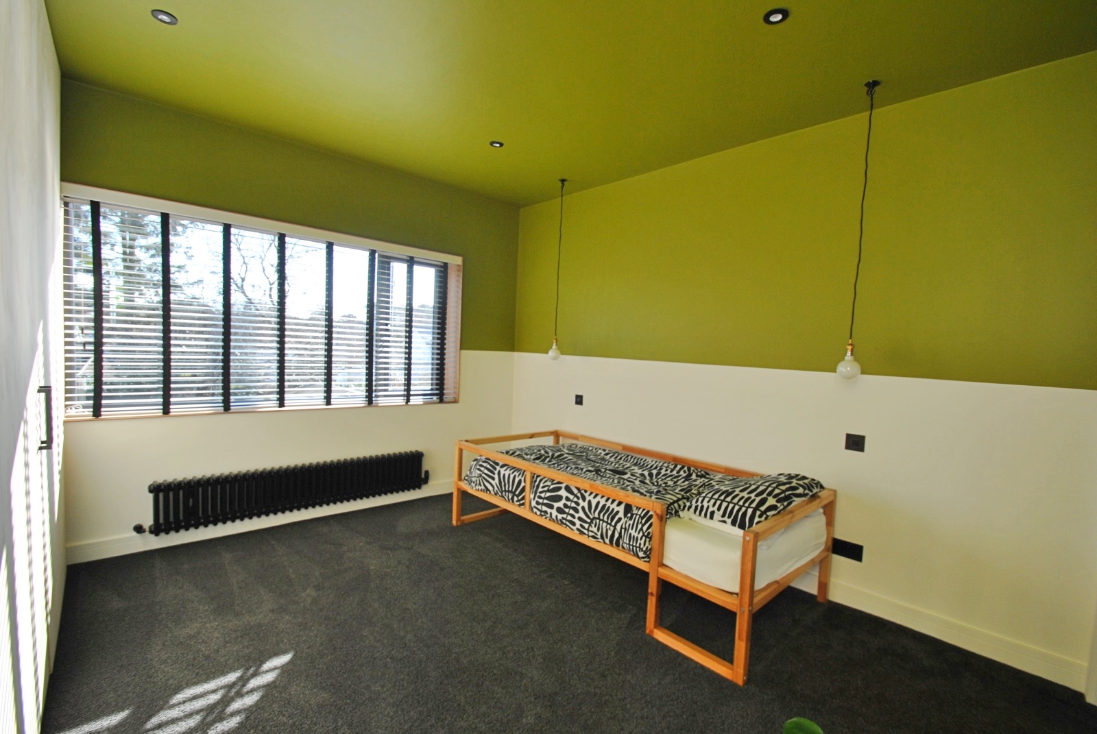 On the second floor is the main bedroom suite with a feature apex window and double doors with a Juliet balcony enjoying a view across the garden and Broadstone beyond. There are built in wardrobes. The en-suite has a free standing bath separate shower WC and wash basin, finished with fully tiled walls.