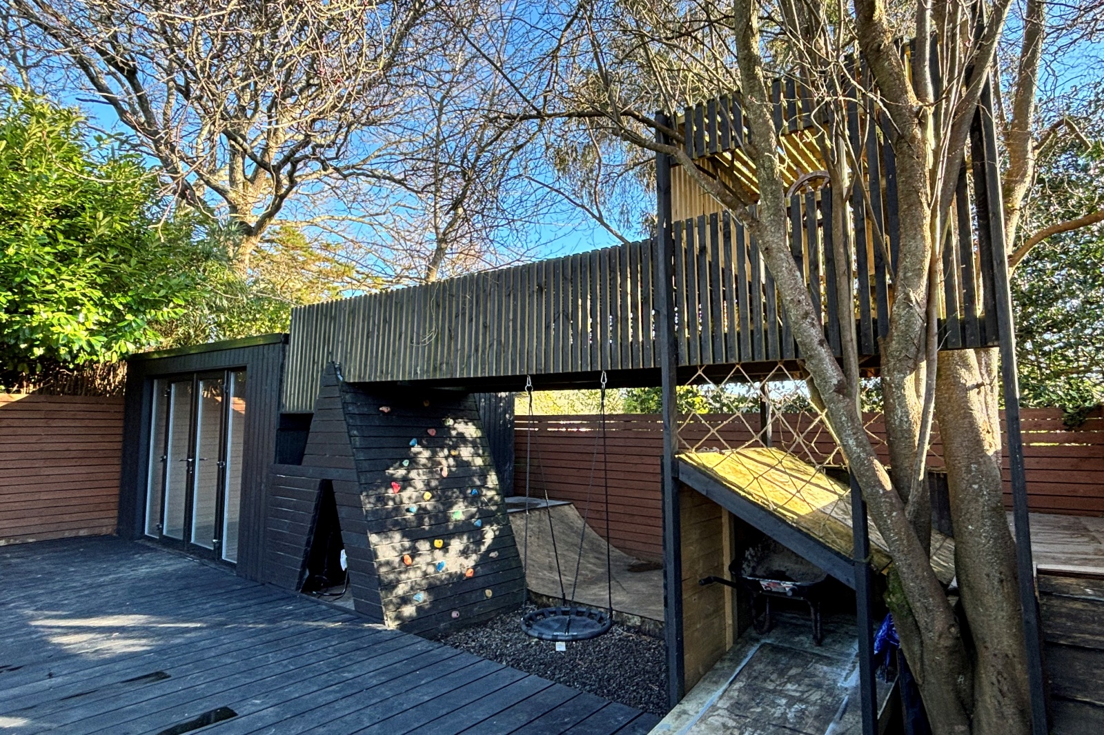 At the bottom of the garden is a timber garden lodge (3.9m x 3.2m) together with a children’s play area and treehouse.